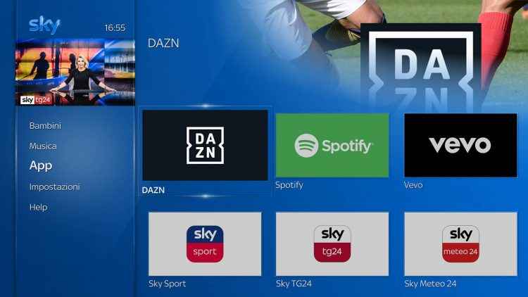 L’applicazione di DAZN sarà presente anche su Sky Q: direttamente dalla Homepage Sky Q, sezione App potrai entrare in modo semplice e intuitivo nell’offerta sportiva DAZN.