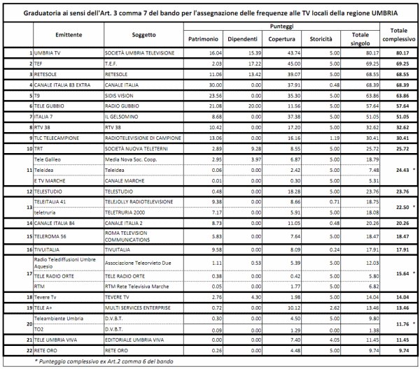 In data 22 novembre 2011 viene pubblicata la graduatoria definitiva relativa all’assegnazione delle frequenze locali nella regione Umbria.