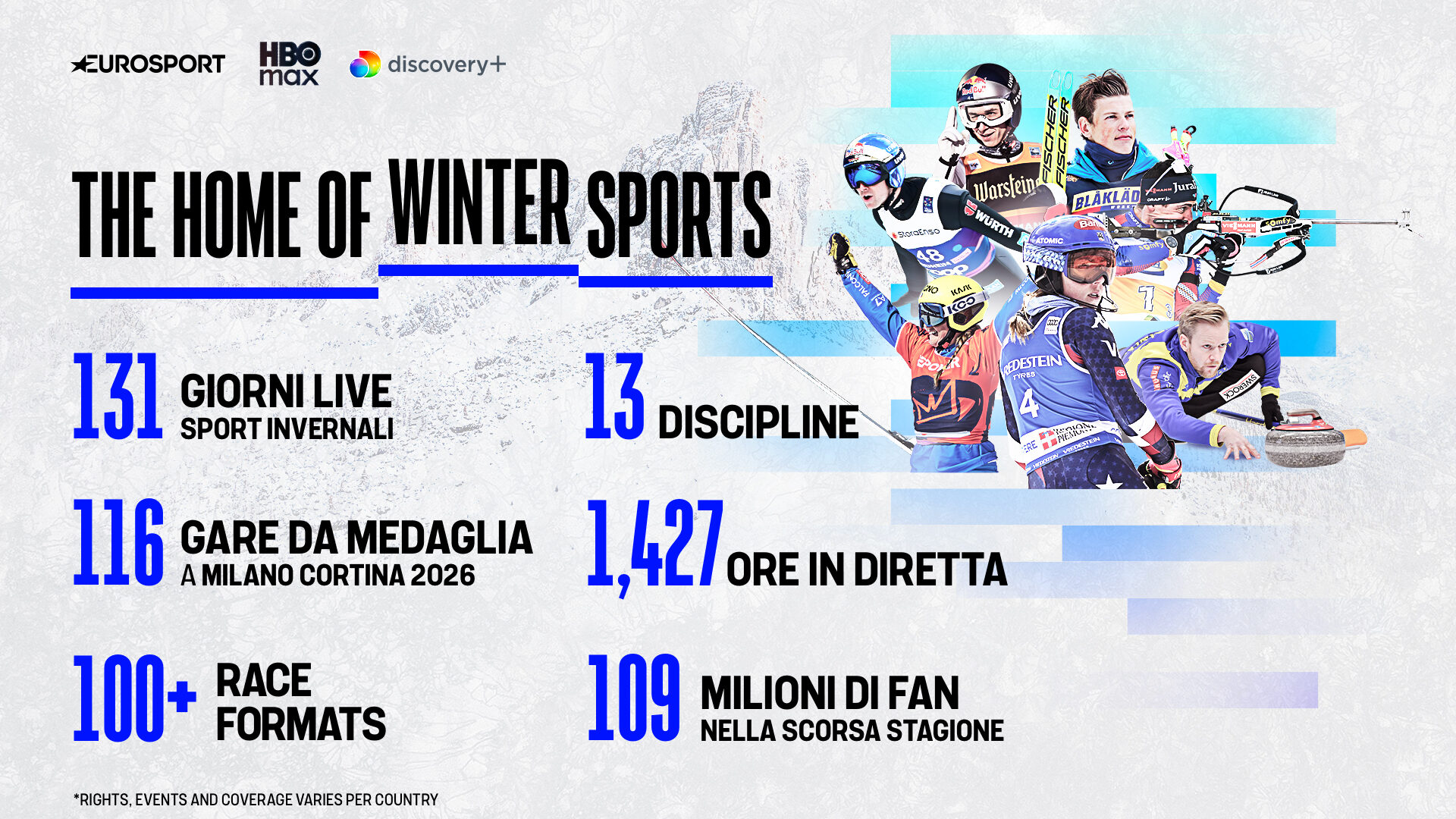 Dopo l’apertura di Coppa del Mondo di sci alpino a Sölden, Warner Bros. Discovery si prepara a trasmettere oltre 1400 ore di sport invernali in diretta per 131 giorni di programmazione. La copertura comprende tutti gli eventi di Coppa del Mondo FIS e FISG – tra cui salto con gli sci, sci di fondo, combinata nordica, snowboard, freestyle, pattinaggio artistico, short track, hockey e curling – oltre alla Coppa del Mondo di biathlon.