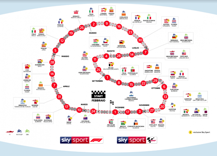 Dal 10 marzo (data d’inizio del Mondiale MotoGP in Qatar, la F1 ripartirà invece il 17/03 in Australia) al 1° dicembre, saranno 8 i super weekend con F1 e MotoGP in contemporanea: 31 marzo, 14 aprile, 30 giugno, 4 agosto, 22 settembre, 27 ottobre, 3 e 17 novembre. E in occasione dei Round di Superbike in Olanda e in Qatar, i fine settimana di gara del 14 aprile e del 27 ottobre diventeranno mega weekend con tutti e 3 i campionati live su Sky Sport.