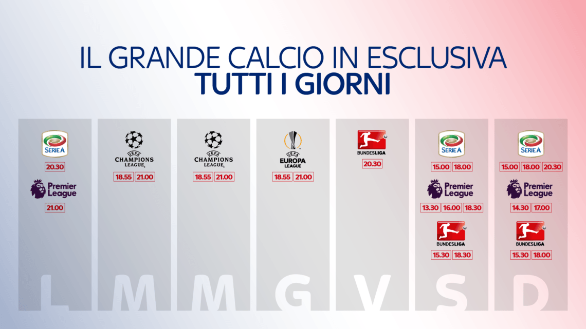 Il meglio del calcio italiano ed europeo sette giorni su sette. Tutti i campioni e tutti i top club: su Sky è calcio in esclusiva tutti i giorni. Dal lunedì alla domenica, i gol e le emozioni delle più prestigiose competizioni, e almeno un match al giorno nelle settimane di coppe.
