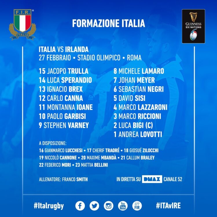 | Sabato 27 febbraio all’Olimpico di Roma si apre il 3° Turno del Guinness Sei Nazioni: è la Nazionale Italiana di Franco Smith ad aprire le danze con il match “ITALIA-IRLANDA”, visibile in diretta e in esclusiva su Dmax canale 52 a partire dalle 15:00 (fischio d’inizio 15:15). | |