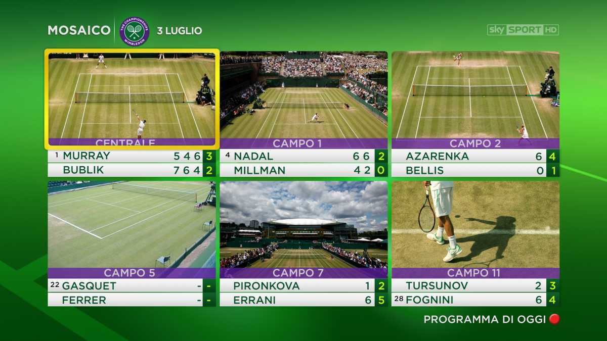E per non perdersi nemmeno un punto, ecco il mosaico interattivo, con 6 canali dedicati: grazie al tasto verde del telecomando Sky, sarà possibile passare velocemente dal Centrale al Campo 1, oppure decidere di vedere gli incontri degli italiani, fra questi anche Fognini, Lorenzi e Seppi, tra gli uomini, Vinci, Errani, Schiavone e Giorgi, tra le donne.