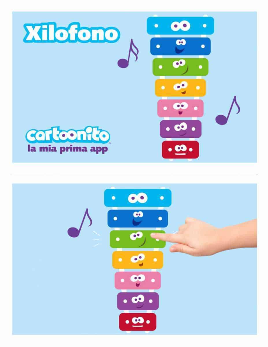 La prima app rilasciata è lo Xilofono, per divertirsi con la musica ed iniziare ad orientarsi tra le note. Ad accompagnare i bambini nei giochi, i Cartoonitos, i simpatici personaggi del Canale che rappresentano le diverse forme geometriche e che in TV introducono gli show in onda.
