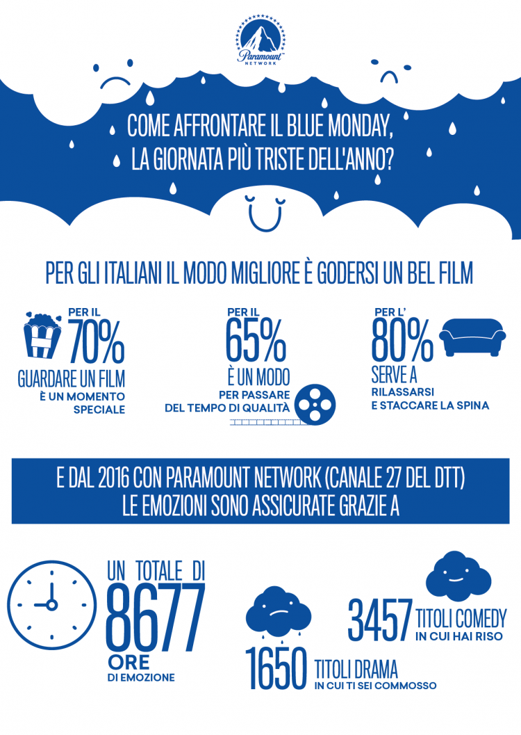Le feste sono ormai finite e il nuovo anno arriva ricco di buoni propositi, sogni ma anche di nuovi appuntamenti e scadenze da rispettare! Sarà forse anche per questo che gennaio ospita il Blue Monday, il giorno più triste dell’anno! Come fare per vivere al meglio questo blue mood? Paramount Network – il canale di intrattenimento di ViacomCBS Networks Italia, visibile sul 27 del digitale terrestre e sul canale 27 di Tivusat che dal 2016 ad oggi è riuscito ad appassionare i propri spettatori con oltre 8677 ore di film, proponendo 3457 titoli di genere comedy e 1650 film drammatici – per questo speciale Blue Monday 2020 offre una serie di pellicole cariche di emozioni che faranno viaggiare lo spettatore verso una storia più bella dell’altra.