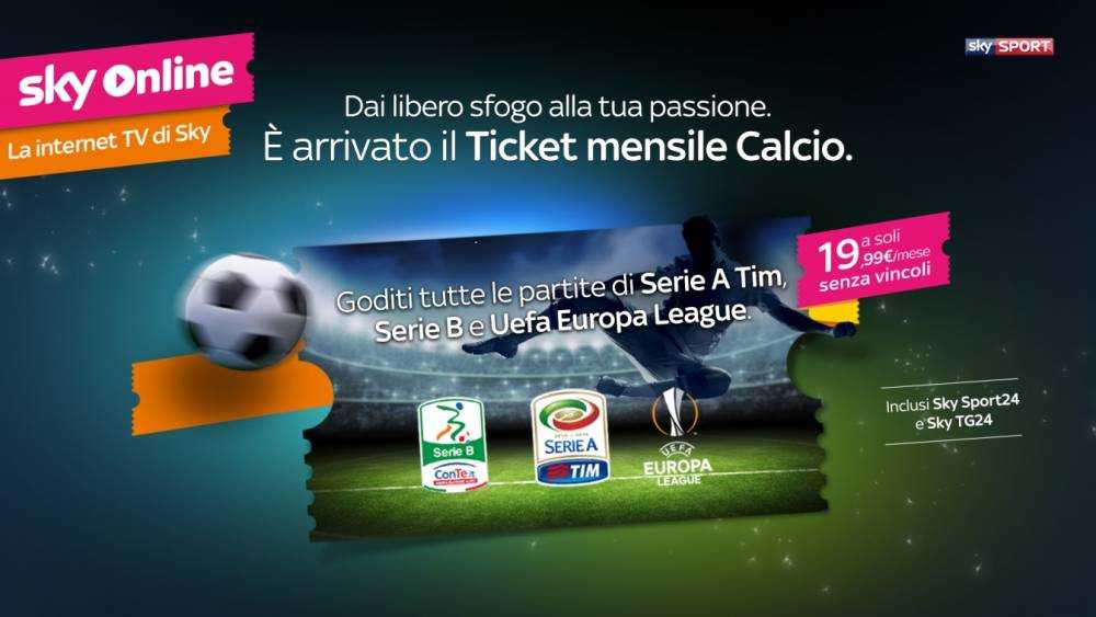 Accanto ai collaudati ticket “Cinema” e “Intrattenimento” (disponibili entrambi al prezzo di 9,99 euro al mese ciascuno o, in bundle, a 16,99 euro al mese), ecco quindi il ticket “Calcio”, acquistabile al prezzo di 19,99 euro/mese. Con questa nuova offerta sarà possibile seguire un mese di grande calcio in streaming con tutte le partite di Serie A e, in esclusiva, quelle diSerie B l’Europa League, con tutte le partite europee di Lazio, Napoli e Fiorentina. In più, chi sottoscriverà questa offerta avrà libero accesso alla visione di Sky TG24 e Sky Sport24. Il tutto in piena libertà, pagando mensilmente e con la possibilità di disattivare il rinnovo automatico in qualsiasi momento, senza vincoli.